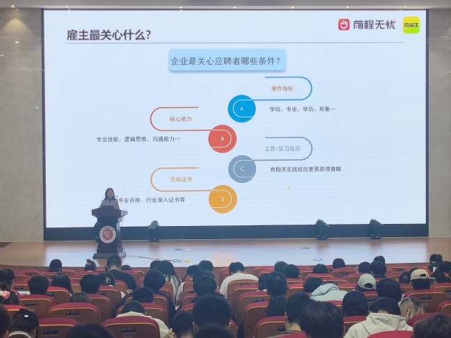 讲座尾声,沈雪琴以“主动出击、保持韧性、拥抱变化”激励学生,指出“求职是自我认知的延伸,每一次面试都是职业认知的升级”,并在互动环节就“跨专业求职壁垒”“实习与秋招时间冲突”等问题给予个性化建议。