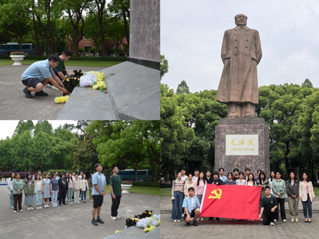 活动的最后一站是复旦大学的毛泽东雕像广场。青铜雕像巍然矗立,伟人身着中山装,手持书卷,目光深邃地凝望远方,仿佛仍在关注着中国青年的成长与国家的未来。支部书记与党员代表缓步走向雕像基座,献上以白菊与黄菊为主体的花束。施文溢同志讲述伟人与复旦的故事。全体同志肃立庄重,表达对先辈的深切缅怀与崇高敬意。随后,支部成员在雕像前合影留念,定格这一庄严时刻。