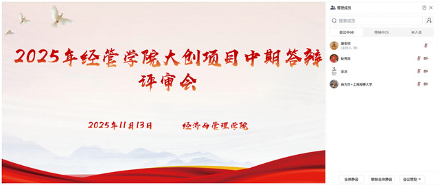 为了系统地评估大学生创新创业项目的阶段性进展情况,强化过程管理,提升创新创业项目质量,11月13日,买球体育官方网站对2025年立项的大学生创新创业项目组织进行了中期答辩评审会。上海市工程管理学会秘书长耿秀丽、上海立信会计学院金融学院副院长吴杰和上海海事大学买球体育官方网站副院长肖光年作为特邀校外专家参加本次评审会。