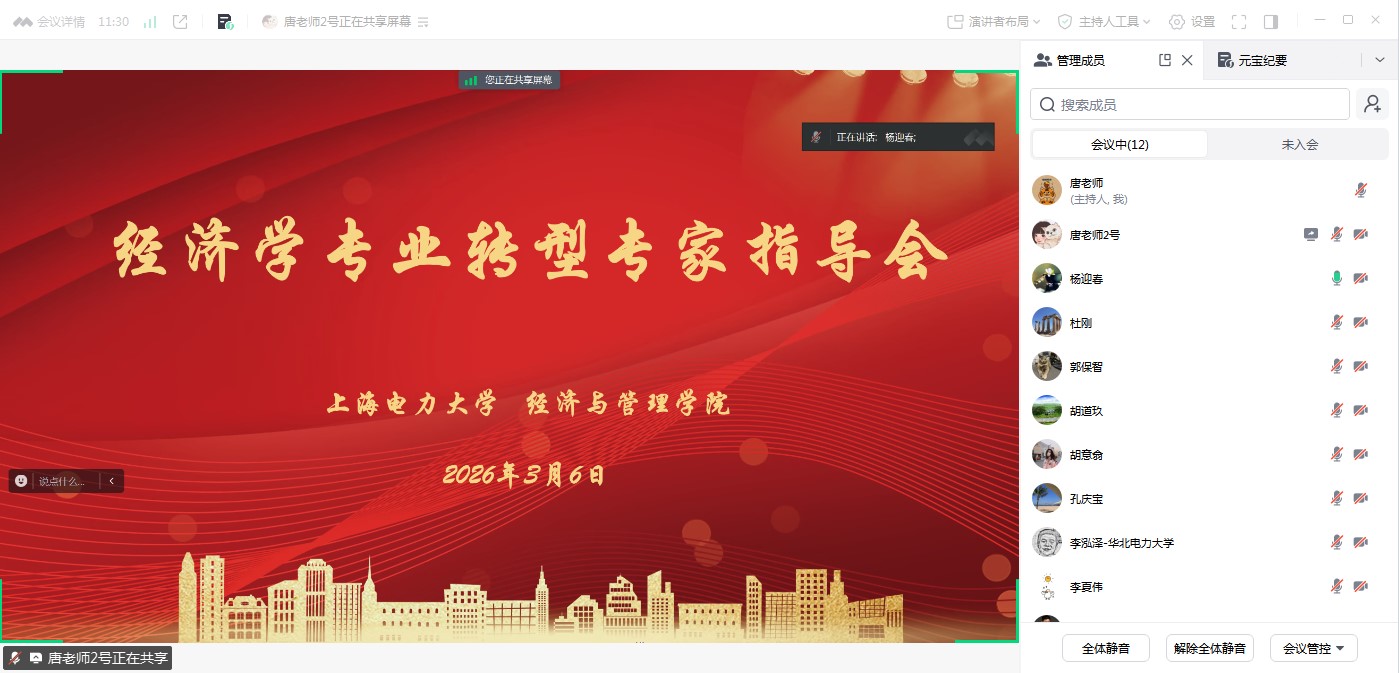 3月6日下午,买球体育官方网站组织召开了本科经济学专业转型升级研讨会。会议特邀华北电力大学买球体育官方网站副院长李泓泽、长沙理工大学买球体育官方网站副院长陈洁、上海路明星光智能科技有限公司业务总监吴迪和原天合富家能源股份有限公司电力交易业务负责人郭保智四位专家进行线上交流研讨。学院党委书记潘华、院长杜刚、院务秘书杨迎春、应用经济系主任胡道玖和经济学专业青年骨干教师参加会议。会议由杨迎春主持。