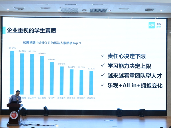 企业用人重品性,就业细心待诸事。顾子勋结合多年的就业指导工作经验,深入解读了企业对于人才的评价标准。他强调,目前多数企业对应届毕业生的责任心、执行力、学习力、团队协作能力等品质较为看重。并分享了企业在招聘过程中关注的细节,如简历撰写、面试表现等,使在场同学对求职过程有了更直观的认识。
