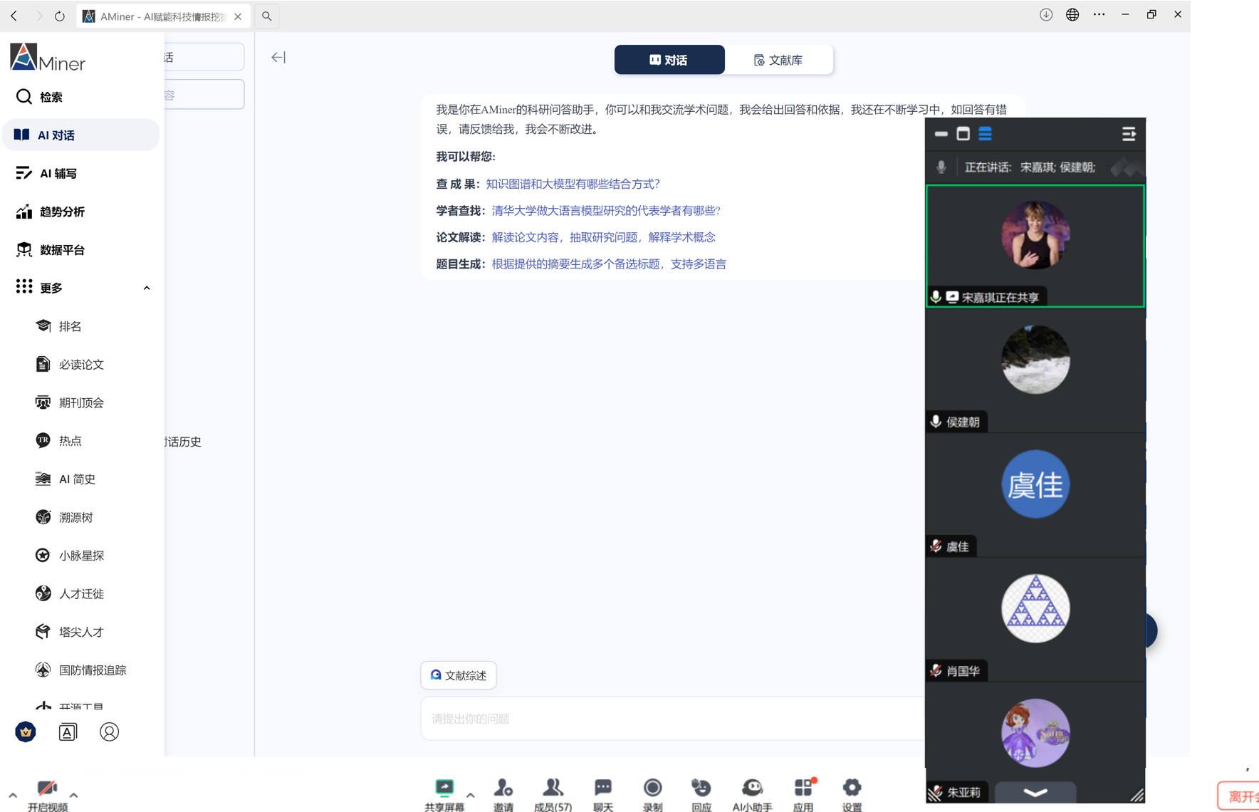 吴艳平和宋佳琪对大模型生成流程与相关功能、在不同场景的应用及功能、图生视频与学术领域AI工具的功能与改进等内容进行介绍和演示。尤其针对融合人类思维链的大模型知识生成流程及大模型检索、基于学者库的信息检索与利用、论文检索阅读平台的功能与优势、Aminer产品与智能体助手的功能及工作原理、智谱清言大模型在多场景下的应用示例、大模型在文字/图片/视频间转换的应用实例、Aminer平台在论文检索与阅读中的功能与作用、论文相关的平台功能及知识库构建、大模型在教育中的高效应用场景检索论述及引用查看流程、大模型在创作中的应用功能及AI工作流等内容进行详细阐述和演示。