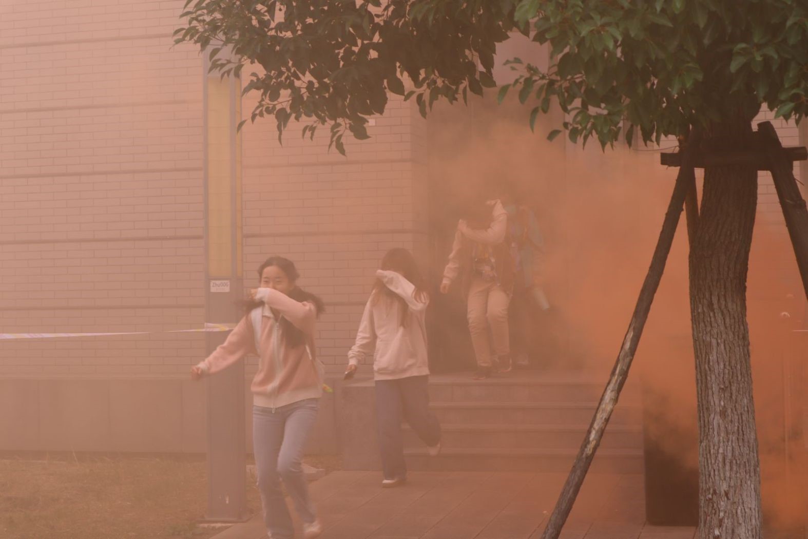 当天11:45分,烟雾弹释放,消防警报瞬时响彻楼道,楼内师生即刻开始疏散。老师带领学生们弯下腰,用湿纸巾等捂住口鼻,从安全通道逃生至楼下安全地带并集合报告情况,整个过程迅速、规范、安全、有序。随后,保卫处代强队长为全体师生展开了安全宣教,示范了灭火器的使用方法,并指导教职工及学生代表操作灭火器进行灭火实战演练。