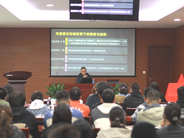 电管家集团总工程师陆玮带来了一场精彩的能源电力发展趋势主题分享。陆玮紧密结合当前行业动态和实际案例,深入浅出地剖析了能源电力行业的未来发展方向,为同学们打开了全新的视野,极大地激发了他们对专业学习的热情以及对未来职业发展的深入思考。